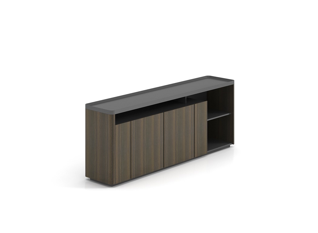 1.遵循系列设计特色,与行政桌相呼应 2.柜体由多个柜门和空格柜组合,更适合分类存放文件和艺术品 3.采用无拉手设计。