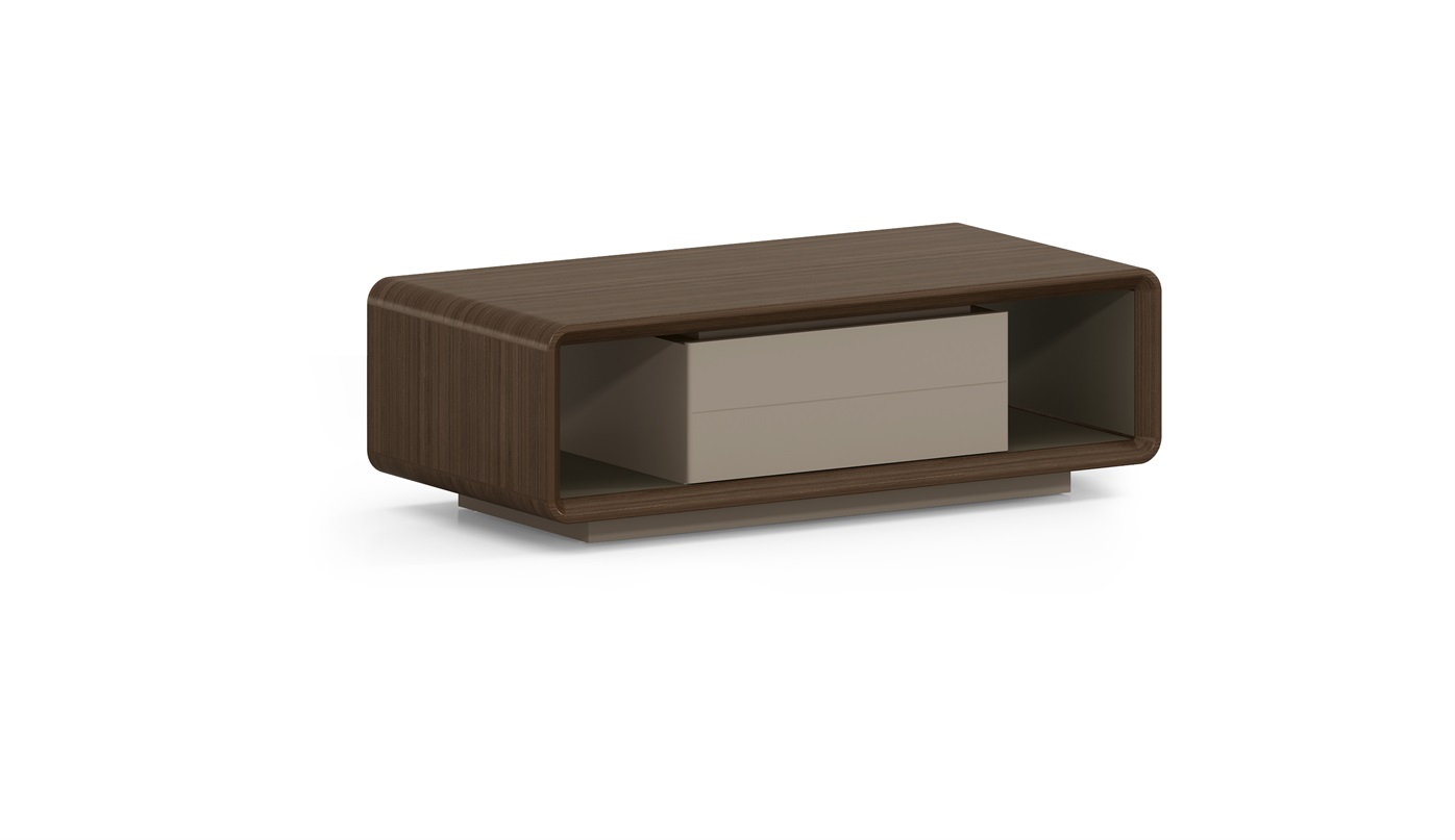 产品板件为E0级中密度中纤板,环保又耐用 色彩搭配:SS-09直纹胡桃+咖啡灰褪色漆; 设计一个咖啡灰抽屉,抽屉面板圆边设计,与柜体形成统一; 台面与侧板采用弧形连接方式; 柜底底座木框搭配,稳定结实; 产品规格:1400W*700D*450H 产品可配行政空间使用